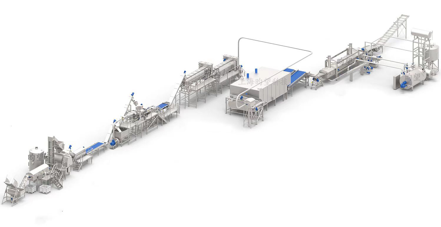 速凍薯?xiàng)l生產(chǎn)線的工藝流程如下:提升機(jī)-清洗脫皮機(jī)-挑揀線-提升機(jī)-切條機(jī)-漂洗機(jī)-漂燙機(jī)-冷卻線-風(fēng)干線-振動篩-油炸線-脫油線-振動篩選機(jī)-挑揀線-速凍線-包裝機(jī)。